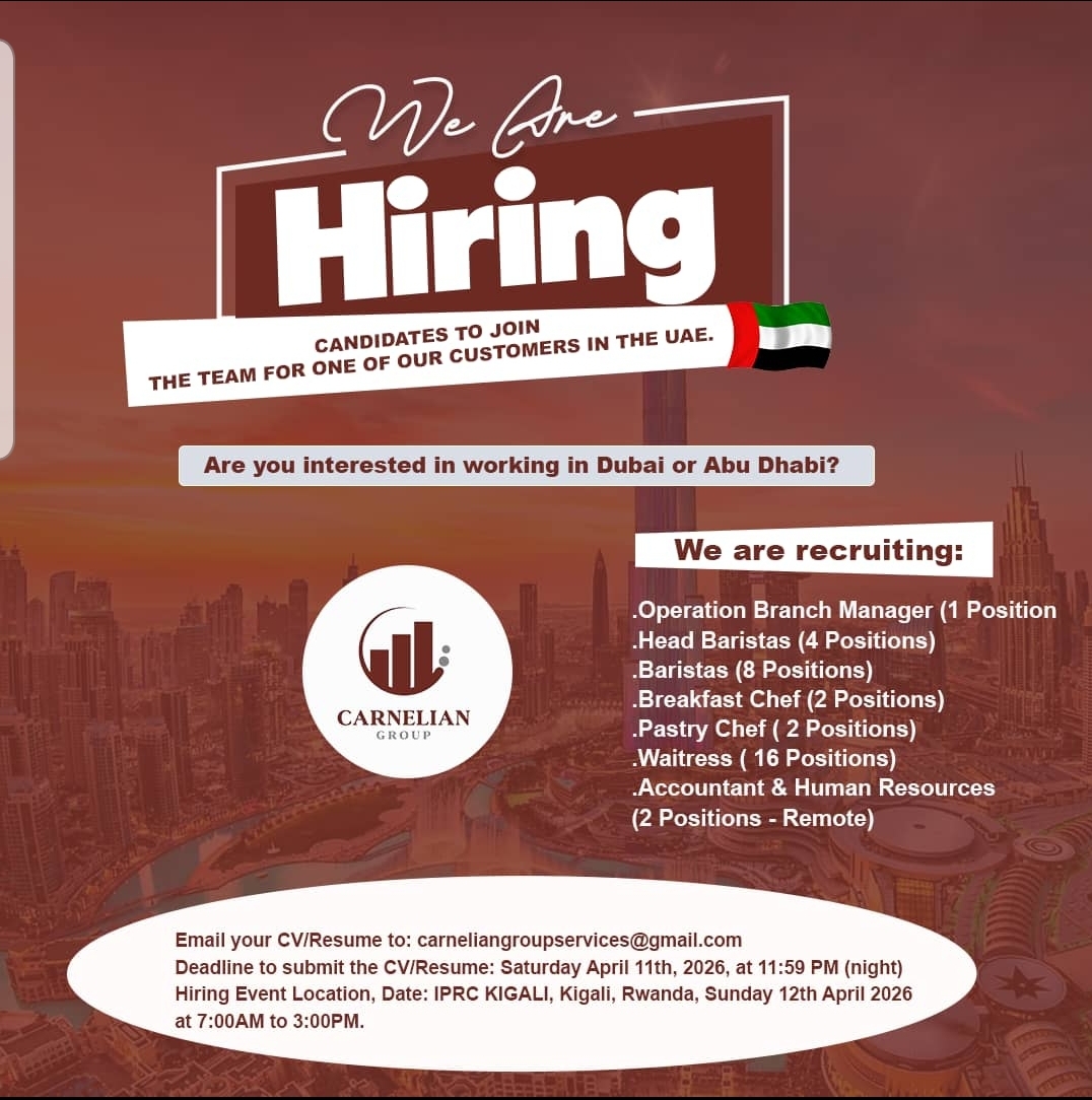 Ikigo Carnelian Employment Services, ku bufatanye na Carramore Group icyicaro Abu Dhabi muri Leta Zunze Ubumwe z’Abarabu (UAE), cyatangaje amahirwe y’akazi ku Banyarwanda bafite ubumenyi mu bijyanye n’amahoteli no kwakira abantu (Hospitality).