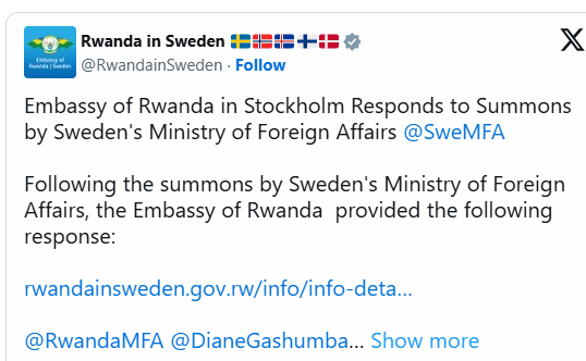Bikubiye mu itangazo ambasade y’u Rwanda yasohoye ku wa 27 Gashyantare 2025 nyuma y’uko Minisiteri y’Ububanyi n’Amahanga ya Suède ihamagaje Ambasaderi w’u Rwanda muri iki gihugu ngo atange ibisobanuro ku kibazo cy’umutekano muke mu Burasirazuba bwa Repubulika Iharanira Demokarasi ya Congo.