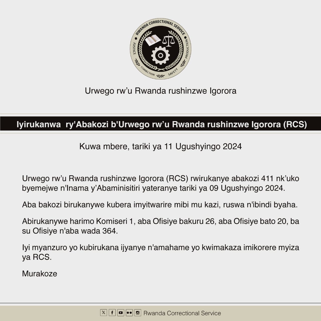 Urwego rw’Igihugu rushinzwe Igorora (RCS), rwatangaje ko rwirukanye abakozi 411 barimo uwo ku rwego rwa Komiseri umwe na ba Ofisiye Bakuru 26, bazira imyitwarire mibi mu kazi, ruswa n’ibindi byaha.